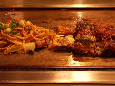 ) 久し振りに本店へ来たので(梅田に姉妹店がありますが、本店の方が美味い)、少し欲張って注文. まずは、ねぎ焼のすじコン(牛すじとコンニャクです)、これだけは外すわけにはいかない定番です. で、ねぎ焼ではない普通のお好み焼でブタ玉、それに、とん平(トンペイ:豚肉を焼いて卵で包んだもの)と焼きそば...(おぃおぃ、ちと多くねぇか