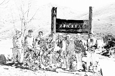 3枚目の絵は、2005年の野焼き後、法華院温泉山荘に山仲間が集結した際に、