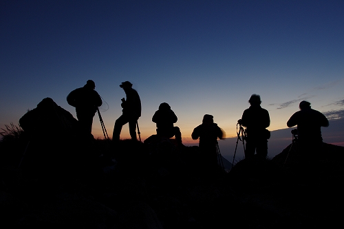 ![]() 夜明けの光景を狙う凄腕のヒットマン(ウーマン含みます )たち...![]() この後、なんとMAX17名が天狗ヶ城山頂にひしめき合っていました もちろん周囲の山々にもしっかりと人影あり.↑ の集団ブロッケン出演者は ↓ の皆さん方です (山靴さんご夫妻、大島さん、GINさん、ボッチさん、ゴリさん)で、肝心の紅葉 の進み具合ですが、10/7時点での牧の戸コースは、昨年とほぼ同様もしくはちょい遅れの進み具合と判断しました.(参考までに昨年との比較写真を掲載しておきます.2日違いですのでほぼ同様ではないかと勝手に判断)今週の天候と気温次第なのでしょうが、牧の戸コースの様子から判断して、大船山や三俣山は次の週末(10/13~14)はピークの少し手前かなと... 昨年の三俣山が10/16で見頃だったため、10/15~19の平日にピークが訪れるのではないかと、責任の持てない素人予測をしてみました 牧の戸コースの見頃はそれから更に1週間程度先になりますかね...2011年10月9日 2012年10月7日 2011年10月9日 2012年10月7日 では皆さん、良い紅葉狩りを ![]() ![]() ![]() ![]()