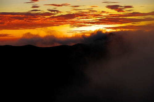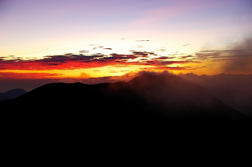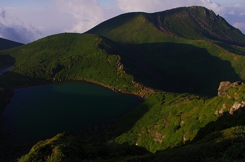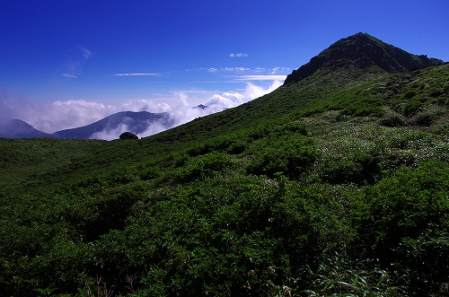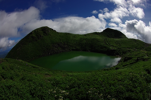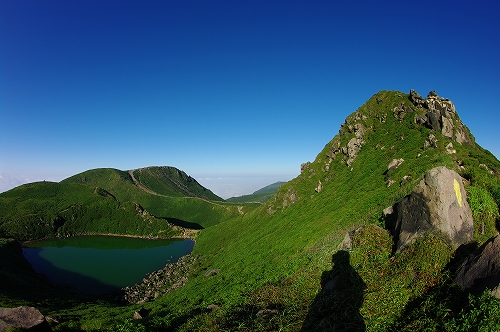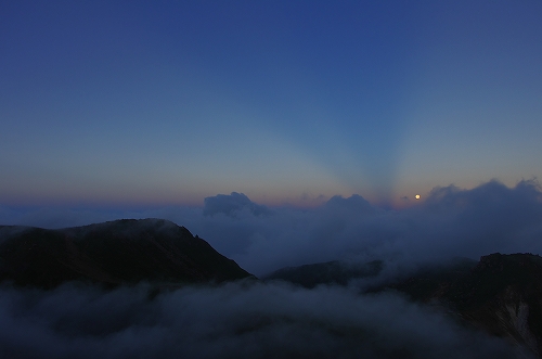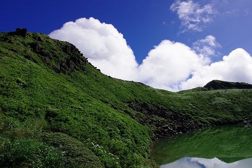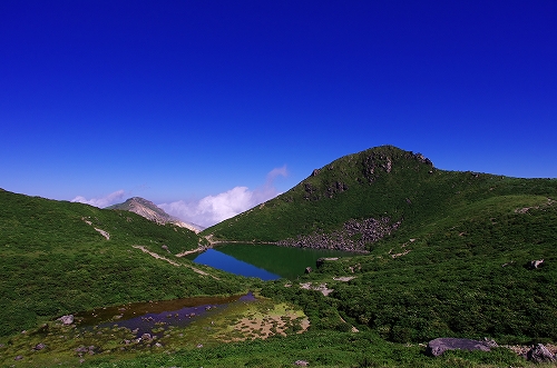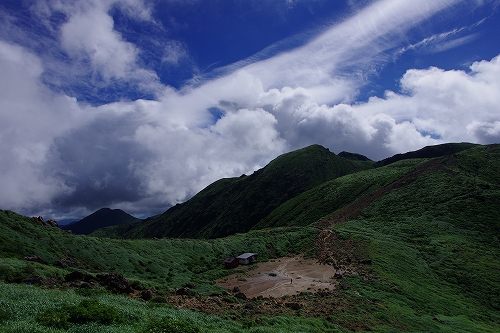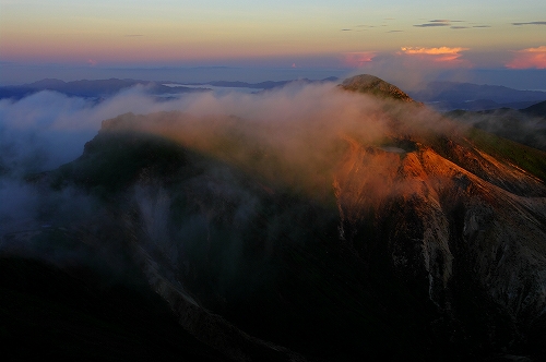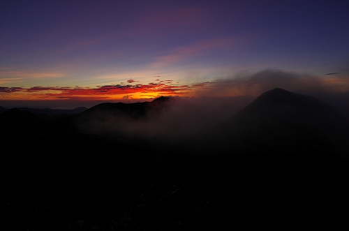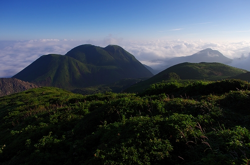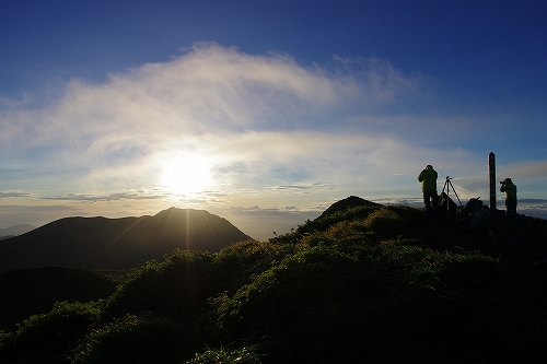が目の前に登場. 山仲間にデリカD5所有者はいないはずなので、全く気にもしていなかったが、突然私の名前を呼ばれて「あれっ!GOTOさんだったんだ 」と相成りました しかも三愛レストハウスで近くに停まっていたのもGOTOさんだったとは...![]() そうこうするうちに予定の2時になったのでMr.IRIEと取り付いた. GOTOさんも少し後に取り付かれたようだ. 今日は単独ではないので沓掛山までゆっくりゆっくりのペースで進む. 久住避難小屋まで1時間30分程度で到着. この時点で、避難小屋周辺は3回連続の辺り一面ガス真っ白状態であった 何度か外の様子を伺うが、上空を見ても一向にガスが晴れる気配が見当たらない![]() そろそろ山頂に向けて出発する時刻 が近付いた時に、小屋の外に出たGOTOさんが声を上げた 外を見ると、先ほどまでの強烈なガスが綺麗に晴れてしまっているではないか 星生崎方面等、周りを見るとガスは未だ残っているので、完全に晴れた訳ではないことを確認. こりゃガスとのコラボになるなと確信して天狗ヶ城へ向かった 山頂へ向かう途中、遠くの空が頻繁に光っている のが見えた. 雷である. 朝駆けでこの光景に遭遇したのは初めてであった.天狗ヶ城山頂から周りの山頂を確認すると、中岳、久住山、扇ヶ鼻に登山者がいることを確認. 扇ヶ鼻は永松さんだったようだ. 天狗ヶ城山頂には、GOTOさんと我々2名、それに後で分かったのだが、福岡の武内さんが一緒だった. この日は抜群の透明度で夜明け前の黎明がことさら美しく 、また、久住高原から星生崎・星生山にかけて流れてくるガスが良い雰囲気を醸し出している. 久しぶりに見るモルゲンロートも美しい. 多彩に染まる空・雲・ガスと、久しぶりにくじゅうの光景を楽しませてもらった![]() 日が昇った後しばらくして、ブロッケン狙いで中岳へ移動したが、その後は結局ガスが流れてこなくて見ることは出来なかった. Mr.IRIEは稲星山へ. GOTOさんはひと足先に池の小屋へ. 私もしばらく山頂でのひとときを楽しんだ後で池の小屋へ移動. 再びGOTOさん・Mr.IRIEと合流した後は、それぞれに下山開始. 今日の一番の目的は「The 夏山」という光景を撮りたかったので、御池周辺、星生崎周辺でそれらしき光景に出くわすことが出来て満足度アップ ![]() ![]() 下山後、これまた久しぶりに「男池のおいちゃん家」へ立ち寄り、美味しいものを堪能させていただき、翁草さんご夫妻やHEROさんにもお会いすることが出来て、非常に充実した山行となった. 次回もこうあって欲しいと切に願って... ![]()
