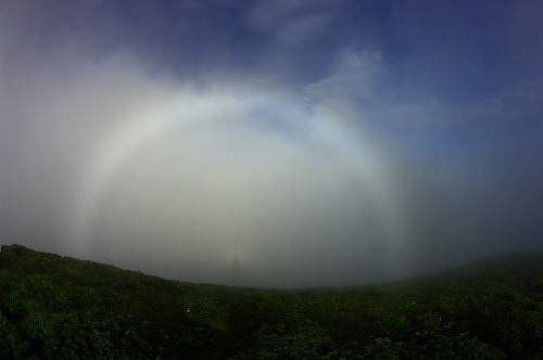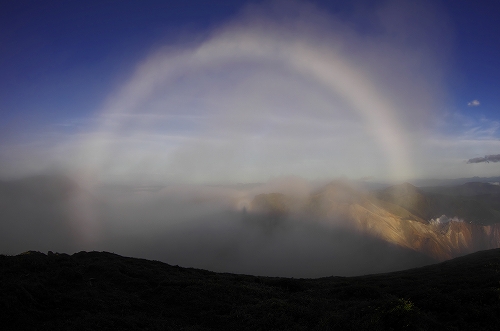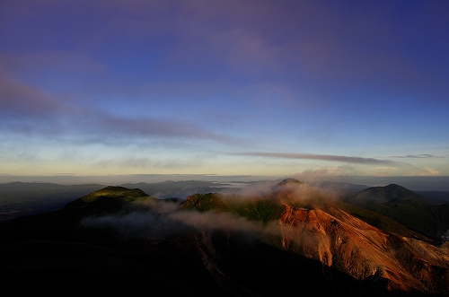 ![]() てっきり先行者が避難小屋に居るものと思っていたが誰も居ない... 避難小屋周辺は8/13と同様、辺り一面がガスに覆われている 結局今回も天狗ヶ城の山頂まで真っ白の中を独歩となった. 天狗ヶ城山頂は珍しく今日もひとりぼっちである. ガスは想定内ではあるが、日の出前後で今日こそはきっとガスが切れるはず という妙な確信を持っていたものの、やはり気合だけではままならぬ事がある.一昨日よりもガスが切れて、青空が何度か見えたもののあくまでも上空だけ... しかもその上空には良い感じの高層雲が見えるではないか! これはもはや生殺し状態である... 空にポッカリと開く青空の窓を見ては溜息の連続であり、これではストレス発散の山行がむしろ逆効果になりかねない... そんな私を見かねてか、くじゅうは唯一の見せ場として白い虹を出現させてくれたが、背景の見えない白い虹は昨年のものとは雲泥の差であり、更にストレス倍増となったのであった ![]() てな訳で、この時点で明日(8/16)も登ってリベンジするぞ!と心に決め、昼過ぎには牧の戸峠へ到着. 到着後しばらくすると雨が降り出しギリギリセーフ 産山へ移動し温泉 に入って上がった頃には雷がゴロゴロと大きな音で鳴り始めていた![]() 温泉の近くにある「山水亭」で久々に大人のオムライスを注文 ここは普通盛りも大盛りも同額なので、腹ペコの際には大盛りを注文することをお勧めします![]() 明日のリベンジに向けて、産山から三愛レストハウスへ移動途中、やまなみハイウェイへ出たところで西の空のドラマチックな光景が目に飛び込んできた 勝手に 「天使と悪魔の空」 と名付けたが、刻々と変化する様子にしばし魅入ってしまった 今日はこれが観れたので良しとし、その後、三愛レストハウスの駐車場でゆっくりと過ごした 駐車場で数台離れた場所に白いデリカD5が停まっているなぁ...と何気に思っていたのだが、それがGOTOさんの新しい愛車だったと知ったのは、夜中に牧の戸峠でお会いした時だった![]() ![]() 8/16へつづく ![]() 今回の白い虹 昨年の白い虹 「天使と悪魔の空」 PR