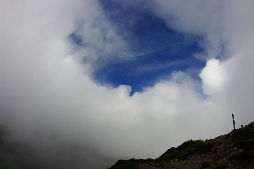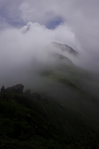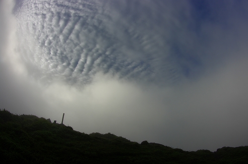 良質なミストを堪能させてもらった8/13から中一日の8/15、牧の戸に到着した2時30分頃、ひとりの登山者が先行された. 準備を済ませて3時ちょうどに出発. 取り付き時は前回のようなガスの発生は無かったが、沓掛山あたりからガスの中へ... 一昨日の山行が良い準備運動になったのか、先行者のライトが見えるところまでと急ぎ足になったのか、西千里浜入口まで45分、久住避難小屋にはちょうど1時間で到着