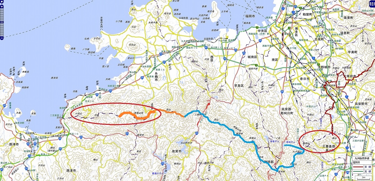 higetias&mamatias&エルさんと【長野峠~羽金山~荒川峠】へ 今年中の「脊振全山縦走(東:基山〜西:十坊山」達成に向けて、残り両端だけとなった... higetiasさん、あと2回お付き合いの程よろしくお願いいたします<(_ _)> レッドの楕円で囲った中に示したオレンジのラインが今回のコース 参考(山行)情報として、higetiasさんのblog記事をリンクしておきます 2014年05月10日【南畑ダム~九千部山~三国峠(三領堺峠)~七曲峠~七曲登山口】 http://higetias.blog.fc2.com/blog-entry-301.html 2014年05月18日【椎原登山口~椎原峠~鬼ヶ鼻岩~猟師岩山~小爪峠~(ブナ林)~金山~アゴ坂峠~三瀬峠】 http://higetias.blog.fc2.com/blog-entry-302.html 2015年03月28日【白糸の滝~羽金山~白糸の滝】 http://higetias.blog.fc2.com/blog-entry-361.html 2015年05月24日【七曲登山口〜七曲峠〜坂本峠〜蛤水道〜蛤岳〜脊振山〜矢筈峠〜唐人の舞〜椎原峠~車谷登山口】 http://higetias.blog.fc2.com/blog-entry-382.html 2015年07月25日【三瀬峠~井原山~三瀬峠】 http://higetias.blog.fc2.com/blog-entry-399.html 2015年12月19日【長野峠~雷山~井原山~木場岳】 http://higetias.blog.fc2.com/blog-entry-437.html 2016年03月21日【長野峠~羽金山~荒川峠】 http://higetias.blog.fc2.com/blog-entry-459.html