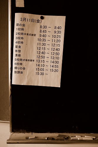 9ヶ月前の今日、これまでの人生で最も衝撃的な出来事が発生した... RICOH GR BLOG "トラックバック企画「2011」に参加" 【震災の語部へ捧ぐ】2011年5月3日blog掲載 縁あって、3月15日から南三陸町歌津中学校にて約50日間、九州各県から延べ50名程度が交代で復旧活動に従事。 その間、生徒さんの思い出が詰まっている大切な教室を、宿泊場所として開放して頂きました。 お借りした3年2組の教室は、卒業式の前日であった震災発生の3月11日6校時から時が止まっていました。 歌津中の生徒さんをはじめ、高校生や小学生も将来の「語部」として今回の震災を後世に語り継いでいく役目を担うことになるでしょう。 歌津中の阿部校長先生から頂いた言葉に、「友あり、道あり、明日あり(歌津中学校 校歌より)」とありました。 将来の「語部」たちを支えていくためにも、今はとにかく私たちに出来ることをやり続けていきたいと思います。/撮影場所:南三陸町 歌津中学校(GR DIGITAL Ⅲにて撮影)