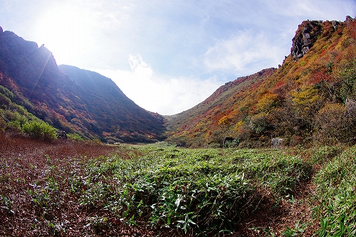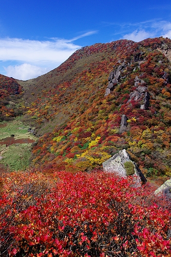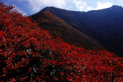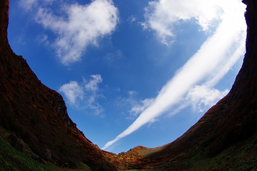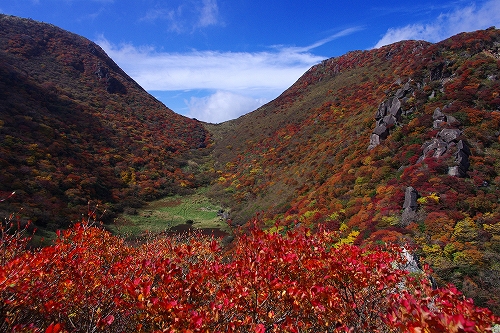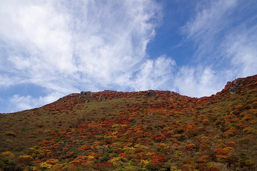 を楽しんできました. 当初、昨年と同様に三俣山経由で大船山へ行くつもりでしたが、急遽単独行ではなくなったため、三俣山オンリーに. 今回は、山靴さんご夫妻、GINさん、nono&kehyさんにお会いしました. 取り急ぎ、kuju-galleryにUPしています. blogでの山行模様は、ぼちぼちと写真も随時追加しながら進めますのであしからず. 紅葉の進み具合は、個人的には好みの状態でしたが、ピークかどうかは判りません. ただ、光線の具合等でそれぞれ感じ方に違いがあると思いますので、直接ご自身の目で確かめられることをお勧めします♭まずは、大鍋の底からの光景をば♭ GINさん、nono&kehyさんのblogに掲載されているが、16日朝、九重連山の上空に素晴らしい雲の流れが発生 大曲で山靴さんとワーワー言いながら眺めていました![]() すがもり越までは、山靴さんご夫妻とほぼ同行. 青空をバックに撮りたかった1枚でしたが、叶わず...