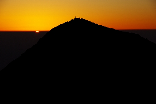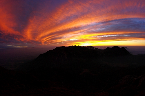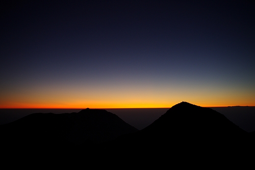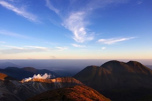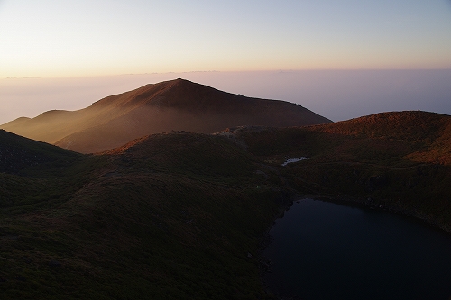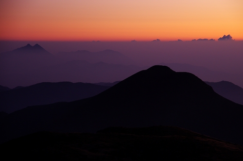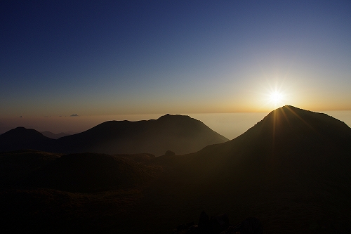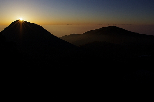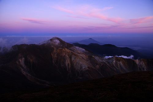 また、西の空には少し雲が広がっており、裏焼け、地球影、なんちゃってダイヤモンド中岳、等々を楽しんだ後、稲星山から中岳方面へ薄いガスが流れ始めたので、天狗ヶ城から中岳へ移動.