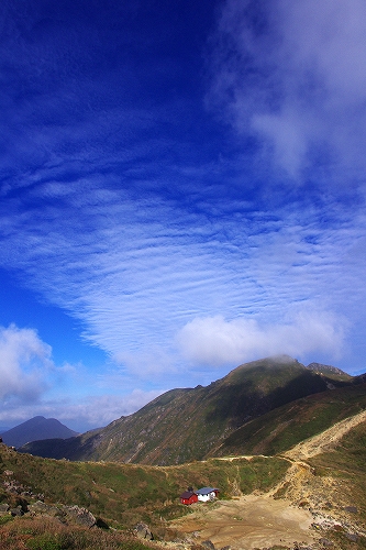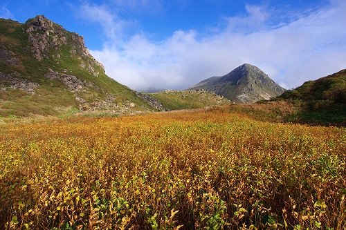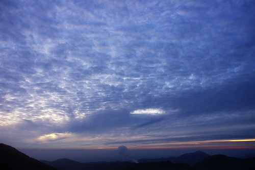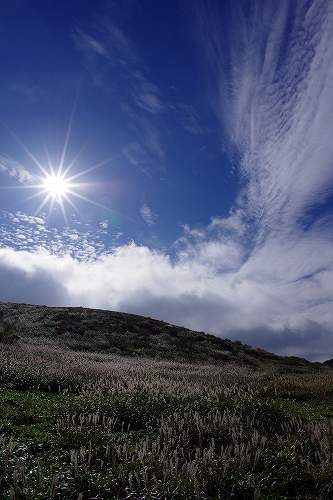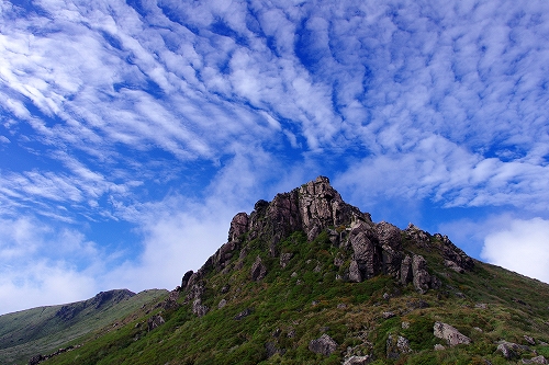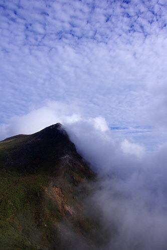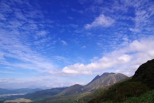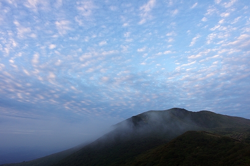 10月最初の山行は、足の具合を確かめるために午後から星生崎まで. 13時過ぎに牧の戸峠へ到着. 夏が終わって雷の恐怖がなくなり、夕駆けが出来る季節となった. 駐車場に到着してすぐにGOTOさんから携帯メールが... 何とすぐ目の前の車中にいらっしゃいました. GOTOさんも夕駆けということでした. 星生崎下でGOTOさんと空の様子を見ていたら、久住山でガスのせめぎあいが発生! そうこうするうちに、星生崎上空の邪魔な雲が切れ始めて、上層の鱗雲と青空が顔を覗かせてくれた♪