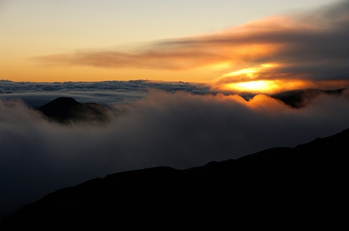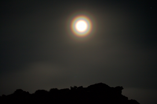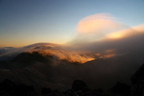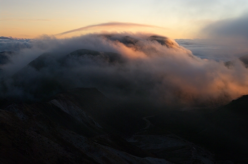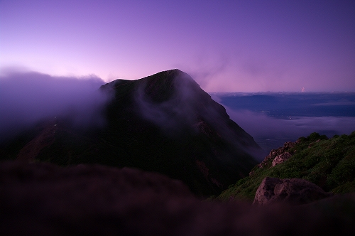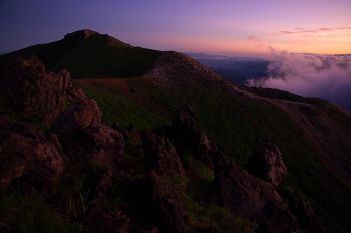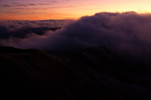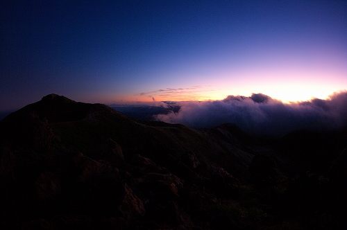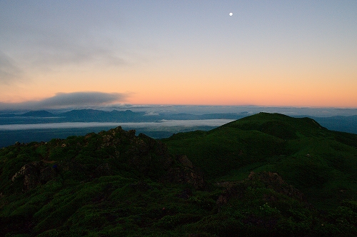そうこうするうちに、久住山の姿も見えなくなる割合が増えてきた. さて、どうしたものかと暫く考えた末、星生崎で夜明けを迎えることに. 上空には綺麗な満月が出ているが、ガスはひっきりなしに流れてくる. 幸いにも、星生崎から星生山にかけては、ガスに埋め尽くされてはいない. ガスがかかる度に虹色の輪郭を纏う満月を撮りながら、夜明けまでの時間を潰していると、どっかりとガスに覆われた三俣山の奥の上空が色付き始めた. 雲海と相まって実に美しい光景であり、この後も、魅力的なガスの光景を楽しむことに... しばらくすると、星生崎から星生山にかけてもガスに飲み込まれてしまったため、いったん避難小屋で待機したものの、晴れるまでにかなり時間を要すると判断し、早々と下山することに