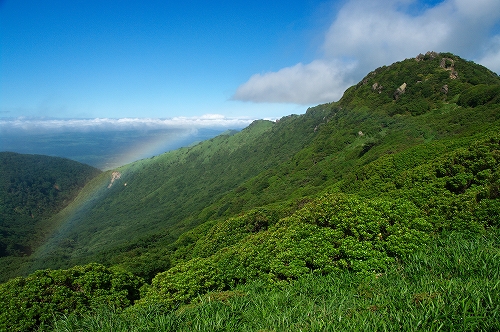 ヤマブキショウマ等を撮りながら、下山途中では綺麗な青空が広がる時間帯もあり、沓掛山付近では半端でしたが、虹も見ることが出来ました. 下山後、男池のおいちゃん家へ向かい、そこでマスターと翁草さんご夫妻に遭遇. 小雨が降る男池周辺は、非常に涼しくて下界の暑さを忘れさせてくれるまさに避暑地でした