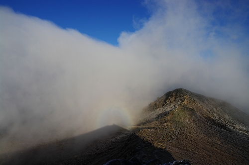 が... この様子だと、GW期間中に天狗ヶ城山頂からダイヤモンド大船山が見れるかもですね? 4月末に霧氷で覆われた山々を見れたのはラッキーでしたが、この暴風状態では山頂に長居は出来ず、でもブロッケンが見れるかもという期待もあって、性懲りも無く中岳山頂へ移動. 案の定、中岳山頂では暴風の餌食となり、何度も転んでしまいましたが、とりあえずブロッケンはかろうじて写っていました
