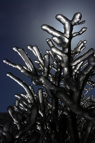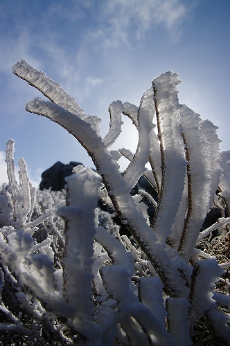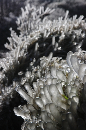 そうこうするうちに、ようやく風の勢いが衰え始め、ガスも晴れてきたので、4月末に見る霧氷の光景を楽しみながら下山開始. 前回と同様、牧の戸峠のレストハウスで、ゆっくりと過ごした後