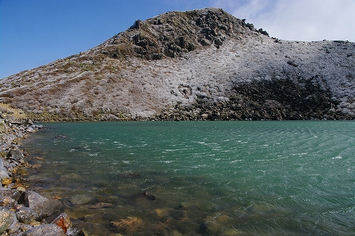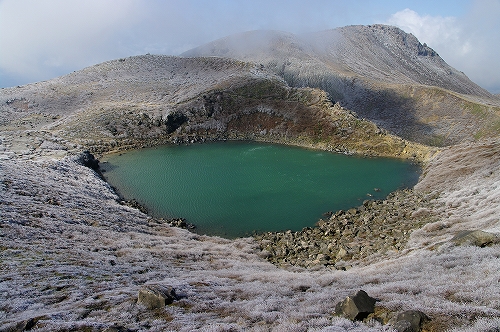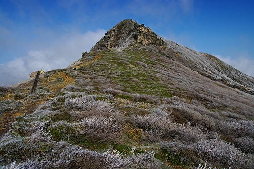 がガスの切れ目から見えましたが、またすぐにガスの中へ... 御池から天狗ヶ城山頂までの間は、3月21日の烈風により撃沈した際と同様に猛烈な風で、気を抜けば身体ごと風に持っていかれそうな恐怖感を覚えつつも山頂へ