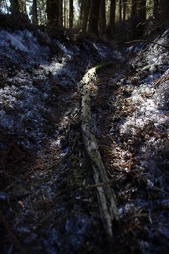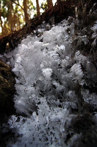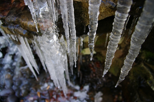 吉部取り付き13時頃. 朝晩の冷え込みで登路のあちこちに出来た綺麗な霜柱を楽しみながら、40分ほどかけて「暮雨の滝」に到着. 想定どおり滝壺はほとんど凍っておらず、水もジャンジャン流れている状態でしたが、見たかったツララらしいツララが出来ており