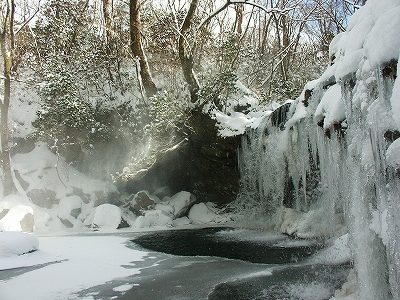 何とか登りきって、新雪の歩き易い登山道をテクテク進むと、暮雨の滝へ下る分岐地点に到着. 冬場なので氷結具合を確かめるために、新雪の深雪をあたふたしながら下ると、水はバンバン流れながらも氷結しかかっている暮雨の滝が姿を現してくれた
