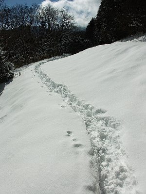 am4時から登り始めてしばらく進むと、どうやら先行者が一人いるような足跡を発見