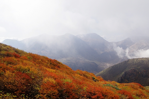 を楽しんできました. 当初、昨年と同様に三俣山経由で大船山へ行くつもりでしたが、急遽単独行ではなくなったため、三俣山オンリーに. 今回は、山靴さんご夫妻、GINさん、nono&kehyさんにお会いしました. 取り急ぎ、kuju-galleryにUPしています. blogでの山行模様は、ぼちぼちと写真も随時追加しながら進めますのであしからず. 紅葉の進み具合は、個人的には好みの状態でしたが、ピークかどうかは判りません. ただ、光線の具合等でそれぞれ感じ方に違いがあると思いますので、直接ご自身の目で確かめられることをお勧めします♭まずは、大鍋の底からの光景をば♭ GINさん、nono&kehyさんのblogに掲載されているが、16日朝、九重連山の上空に素晴らしい雲の流れが発生 大曲で山靴さんとワーワー言いながら眺めていました![]() すがもり越までは、山靴さんご夫妻とほぼ同行. 青空をバックに撮りたかった1枚でしたが、叶わず...