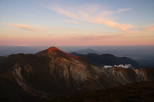また、西の空には少し雲が広がっており、裏焼け、地球影、なんちゃってダイヤモンド中岳、等々を楽しんだ後、稲星山から中岳方面へ薄いガスが流れ始めたので、天狗ヶ城から中岳へ移動.