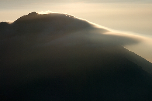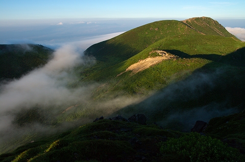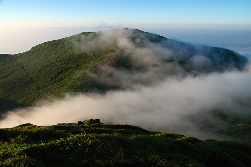 ![]() 久住避難小屋に到着すると、そんな心配は全くの無用でした. 小屋の前には大勢の登山者がたむろしており、小屋の中に入るとそこには、gin_mhさん、大空さん、森川さんの3名がいらっしゃった. 皆さん今日は中岳を予定されているとのことだったので、同じ場所に集中するよりも分散した方が良いので、私はまたしても天狗ヶ城へ. 御池に到着すると、中岳はすっぽりとガスの中. 天狗ヶ城はかろうじて山頂が見え隠れしている状態であった. gin_mhさん、大空さん、森川さんの3名も天狗ヶ城へ予定変更されるかもしれないなぁ~と思いながら山頂に到着. しばらくすると、団体メンバーが5名程到着. その後、つり尾根で状況判断されて中岳から天狗ヶ城へ予定変更したgin_mhさんが天狗ヶ城へ到着. 山頂は相変わらずガスがひっきりなしに迫ってきてるが、上空が晴れているのでガスのショーになるのはほぼ間違いない状況. 中岳・久住山・稲星山は、山全体がガスのベールにすっぽりと包まれており、生クリームでコーティングされたかのようである. 夜明けが近付くにつれ、色付いた東の空と大船山がガスの向こうに見え隠れし始めた. 真っ赤な太陽が大船山頂横に顔を覗かせた後、ようやく中岳の山頂も見え始めた. ガスのショーをしばらくの間楽しんだ後、ブロッケン狙いで中岳へ移動. 中岳山頂には大空さん、森川さんの他にも数名の方が撮影中. 久住高原から稲星山へ流れ込んでくるガスが面白く、そのうちガスの流れがつり尾根側に変わり始めたので、ブロッケンの撮影場所にスタンバイ. 最初は薄いガスの状態だったが、その後は怒涛のごとくガスというか大量の雲が流れ込んできて、スケールの大きな光景を堪能することができた ![]() 8時頃には再びガスで覆われ展望がきかなくなったので、gin_mhさんと下山することに. 御池で本日最後のブロッケンに遭遇. 下山の途中途中で、気持ちの良い涼しい風を堪能しながら牧の戸峠へ到着. 昨年に続いて8月は私好みの光景に出会えたので、くじゅうの女神に感謝♪感謝♪である. 8月の山行目標⇒あと2回...行けるかなぁ~...? ![]() ![]() 今年は夏季休暇を飛び飛びで取得しており、今日は平日山行である. 平日とは言いつつも夏休み期間中のため、それなりに登山者はいるだろうと思いながら牧の戸峠に着くと、辺り一面ガス状態で支度をしている人影も見えず... ガスの中、ひとりぼっちの淋しいスタートと覚悟したその時、すぐ近くの車の方から声がして原園さんが登場