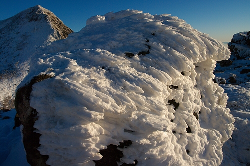 年始から天候とスケジュールのタイミングが合わず、やっと2011年の登り初め... 昨年からの予報どおりで、今シーズンは厳冬となり雪の量もたっぷりである. 遥かなる大船山へ行きたい気持ちでいっぱいだったが、体力的に準備不足であり、しかも雪山となると尚更なので、必然的に牧の戸峠からの取り付きとなった. 途中、やまなみにさしかかった地点で、外気温はマイナス10℃以下となっていた. 峠の駐車場に着くと、10台以上の車が既に停まっている. もちろん山仲間達も大勢いるようである. ちょうど駐車場へ到着された木下さんと挨拶を交わした後、am4時に取り付き開始. 途中ではオアシスさんとも遭遇.(その後も久住避難小屋・中岳山頂・池の小屋で多くの方々と出会えました) 快晴の中、中岳山頂でモルゲンロートを楽しんだ後、吊り尾根で永松さんと遭遇し談笑. 池の小屋へ向かうと、案の定多くの山仲間が揃っていた. 食事を摂りながらしばらく談笑していると、ほとんどのメンバーが夕方まで残るとのこと. 想定はしていたが、朝から晩までこれだけ大勢のメンバーが山に居るのは、非常に珍しいことである. それだけ皆さんこの日を待ち焦がれていたんでしょうね. いったん西千里浜まで戻り、シュカブラ等を撮りながら夕暮れまでの時間をつぶし、今日の締めは星生崎下でアーベントロート狙いとした. GINさん、翁草さんも同じ狙いのようで、ご一緒することとなった. nonoさん・kehyさんもここへいったん立ち寄られたのでご挨拶. 17時頃から山肌が徐々に色付き始め、皆さん思い思いのポイントで30分弱のショーを楽しんだ. 私も残照まで粘った後、久住分れ上の台で撮影されていた木下さんと合流して18時前に下山開始. 下山後、きづな温泉に立ち寄り、さっぱりしてから帰路へ