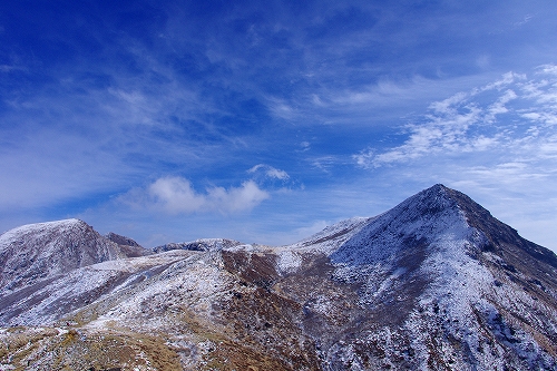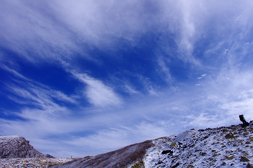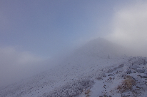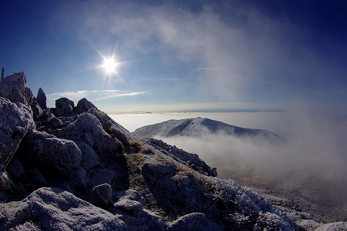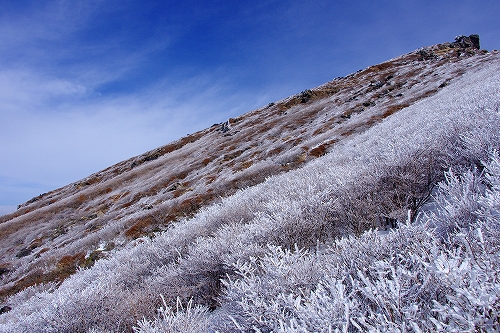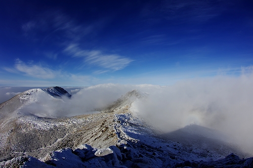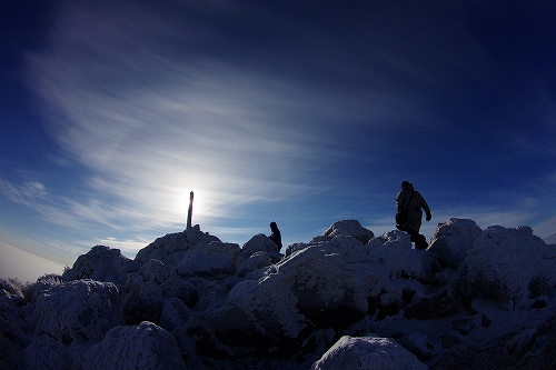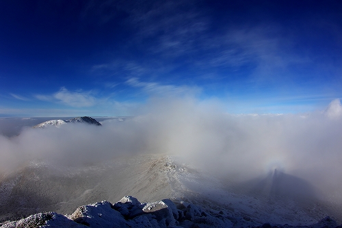 上空に薄雲が広がり始めて大きな日暈も現われた. 再び下山を開始して台地に立ち寄ったところで、またしても空の良い表情に酔いしれてしまい、しばらく道草状態に... 久住分かれ手前でもまた道草をしていると、先週の星生山稜線でお会いした白ヘルおじさんが登場♪ しばらく談笑した後に白ヘルおじさんを見送り、さて夕方まで粘るかなという考えも頭の中を過ったが、アーベントロート等はどうも期待出来そうにないので今日はこのまま下山することに決定. 星生崎下で久住山の雄姿を楽しみ、西千里浜で記録写真を撮った後で、ようやく牧の戸峠へ向けて意識的に足を進めることが出来たように思う. それ程今日の空模様は私好みだったわけで、こんな日は必然的に縦写真が増えることから、+kuju-gallery に縦写真オンリーでまとめてUPしてみた. 15時頃に牧の戸峠に到着. 今のご主人が運営されるのが今日で最後となる「きづな温泉 」に立ち寄り、ゆっくりのんびりと疲れをとってから帰路へ![]() ![]() 早朝のガスに好かれてしまっているが、次こそは綺麗なモルゲンロートにも出逢いたいなと切に思う今日この頃である...おしまい. <白ヘルおじさん登場♪> ガスの中から姿を現した山々を天狗ヶ城山頂で楽しんだ後、ブロッケン狙いで中岳へ移動された木下さんの後に続いて私も移動開始. 中岳山頂の岩稜には立派に成長した汚れのない海老の尻尾がびっしりと付いていた. 目当てのブロッケンは、断続的に見ることは出来たものの、スクリーンが厚過ぎたためか彩度や輝度が低かった. 写真では少々分かり辛いかもしれないが、そんな悪条件下でも集団ブロッケンが見れたので良しとしておきたい.
