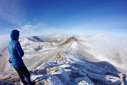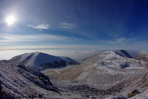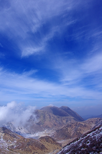 午前中に吉部から暮雨の滝、午後は牧の戸峠から星生稜線へ. 積雪量は20cm程度であったが、吹き溜まりでは膝上の場所も 特に吉部コースでは先行者の無いバージンスノーを歩いたが、非常に軽い雪質で抵抗感の無い不思議な感覚を堪能させてもらった 暮雨の滝は例年よりも水量が多いのか、凍結はしているものの水はバンバン流れており、いささか拍子抜け 吉部への復路では、頭上から容赦のない大量のスノーシャワーが降り注ぎ、新雪の洗礼を浴びまくりました![]() ![]() 牧の戸コースでは西方面からひっきりなしに流れてくるガスが、良い光景をサプライズしたり意地悪をしたりで、今日はワクワク・ハラハラ・ドキドキのジェットコースターのような山行であり、最後の最後に心残りの状態で幕が下りたため、次回も星生稜線で夕暮れを楽しみたいものである ![]() ![]() つづく... PR 池の小屋に到着寸前で原園さんと再び合流. 誰も居ない池の小屋で食事をしていると、そのうちだんだんと人が増えてきて、最初から居る身としては早く席を空けなければいけない症候群にかられ、昼前に小屋を出発. 全面真っ白に氷結した御池を歩いていると空の表情が素晴らしく良くて、いったん御池を過ぎて下山しかかったものの、再び天狗ヶ城の途中まで上って、その光景を楽しむことにした.